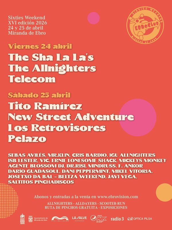 El festival Ebroclub, organizado por la Asociación Cultural Amigos de Rafael Izquierdo (la misma detrás del popular Ebrovisión), celebrará su 16º aniversario este fin de semana, los días 24 y 25 de abril, con dos días de conciertos para los amantes de los sonidos sixties más actividades paralelas, todas ellas gratuitas, como ruta de scooters, ruta de pinchos, allnighters y alldayers, exposiciones, conciertos diurnos…