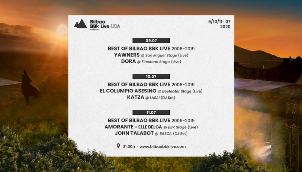 ACTUALIZACIÓN 2 julio: Directos de El Columpio Asesino, Dora, Amorante y Yawners, DJ sets de John Talabot y Katza y el humor de Pantomima Full, en el cartel definitivo de Bilbao BBK Live 2020.