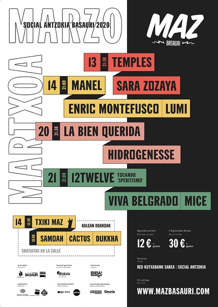 Entramos en el mes de MAZ Basauri 2020, la novena edición del festival, que traerá a Temples, Manel, La Bien Querida, Hidrogenesse, 12Twelve, Sara Zozaya, Enric Montefusco o Viva Belgrado al Social Antzokia de Basauri los días 13, 14, 20 y 21 de marzo (además de actividades para txikis y conciertos gratuitos en la calle el sábado 14). Pero, antes de eso, Bilbao acogerá dos actos que servirán para ir abriendo boca. Será en la tienda Fnac de Alameda Urquijo y con la colaboración de BI FM.