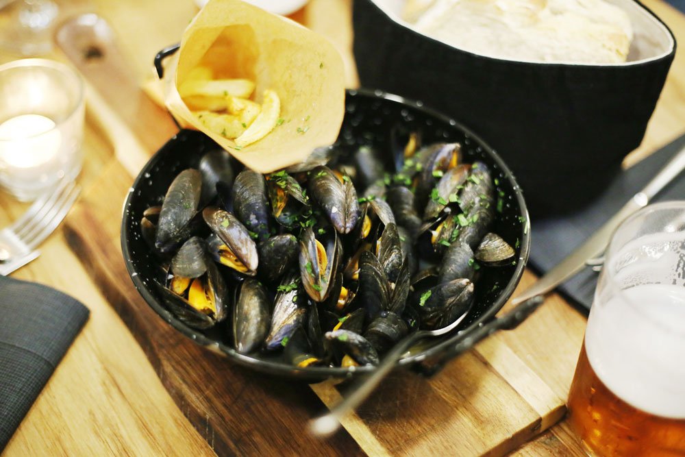 Nos sacan la carta donde hay cositas para desayunar, bagels, tostas, burritos, raciones… También se ven pintxos en la barra. Cuadra con la descripción del caralibro. Miramos a de la Maza. «Vamos a pedir unos moules con patatas fritas, un rollo muy belga», decide. ¿Los mejillones buenos son los pequeños? «Lo que de verdad importa es que tengan sabor», responde.