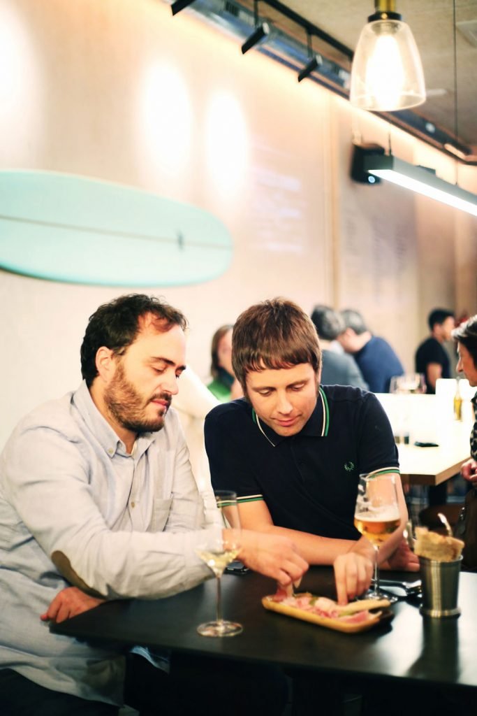 El sol aparece y desaparece como un miembro más de los Bee Gees en el vídeo de «Stayin’ Alive». La Real juega partido de la Europa League. Hemos quedado a las 8 con Xabier de la Maza en la calle Peña y Goñi del barrio de Gros. Este donostiarra de 34 años es uno de los socios e ideólogos de la panadería The Loaf, el negocio de productos locales Pantori y Musika Parkean, entre otras iniciativas. Abierto y dicharachero, conoce a media ciudad. Su penúltima ocurrencia ha sido la sanguchería (sic) peruana Ekeko que se inauguró a finales de agosto. Llega con un llamativo chubasquero de color naranja que se parece a uno que tiene Liam Gallagher, pero que, según cuenta, compró en Suecia. De la Maza va a ser nuestro cicerone y hombre de confianza.