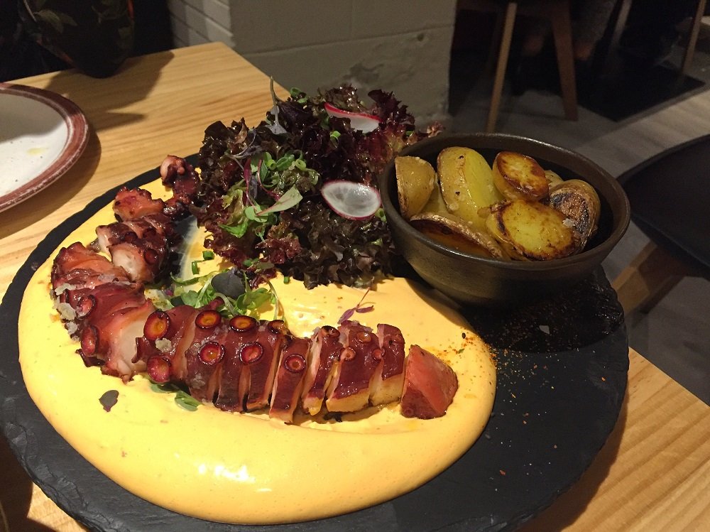 Los platos en Ad Hoc Cascanueces se sirven al centro para compartir, no disponen de platos individuales aunque sí de medias raciones para aquellos platos que han de servirse por pieza completa. Era el caso del primero, ‘Pulpo, papines y mayonesa picante’ (29 €) llegaba a la mesa con una generosa pata de cefalópodo que untar en mayonesa de mojo picón, unas patatas crujientes y tiernas… y una ensalada aliñada con lemongrass de la que no quedó ni una hoja. Ración enorme ¡Nos encantó!