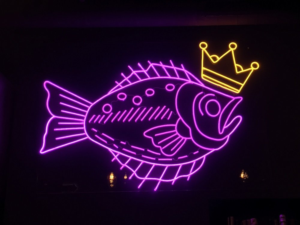 Cuando nos pasamos por allí vimos que el local no era demasiado grande, eran más un bar con mesas para comer que un restaurante. Razón por la que reservar es imprescindible aquí. Somos dos, nos asignan un mesa de las altas ¡Vaya por dios! Todo lo impregna una luz morada que aportará un filtro en mis fotos que no tiene remedio, pido perdón de antemano. El logo, diseñado por Katie de Trojan Tattoo (mi tatuadora y la del dueño del local), un pez que es tan protagonista como la luz.