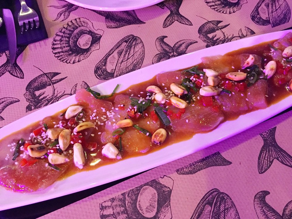 Con la carta en la mano decidimos centrarnos en los tiraditos, ceviches y seguir a pies juntillas las recomendaciones que nos hicieran. Nuestra comanda incluye un tiradito de atún con salsa nikkei, el pescado crudo y cortado en finos filetes combinado con una mezcla de salsa de ostras y soja que untamos hasta decir basta. ¡Está rico!