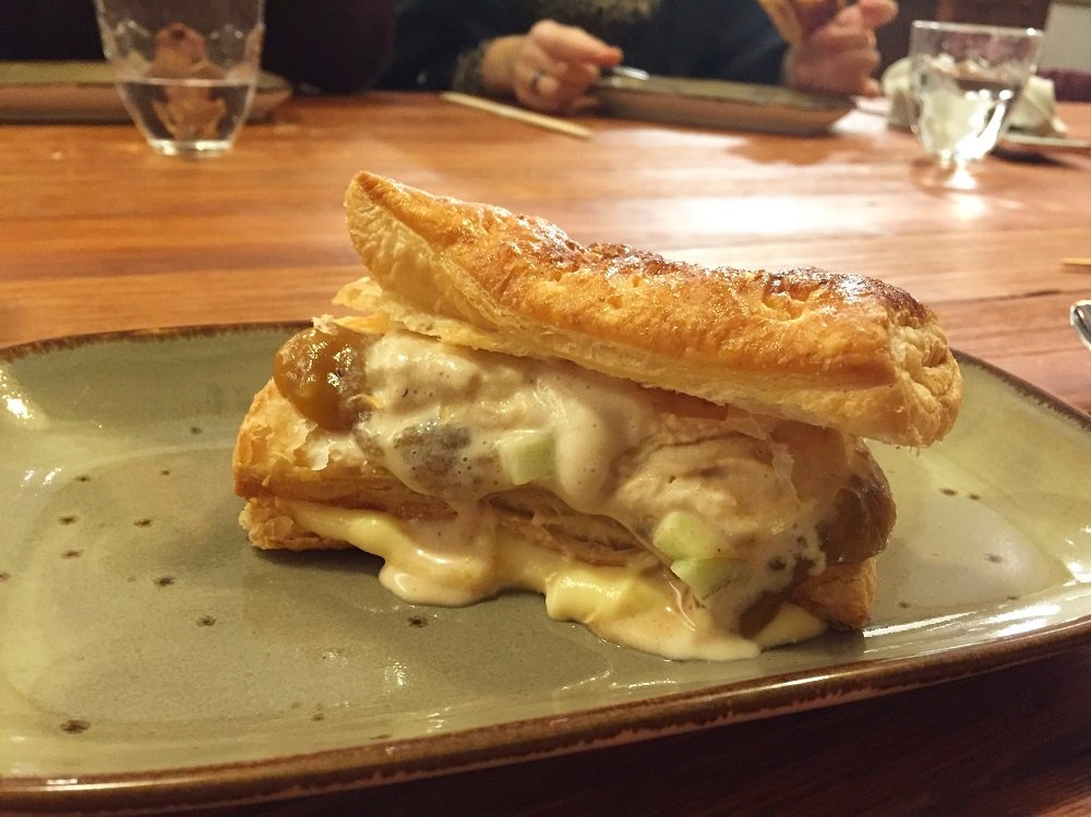 A estas alturas de la película, hubo quien abandonó el barco. Nosotros nos mantuvimos firmes. Llegaron los postres adecuados para bajar y facilitar la digestión: “Gin tonic en texturas”, una gelatina de gintonic, espuma de tónica y granizado de limón. Lo que es un “digestivo“ de toda la vida pero para comer con cuchara. El segundo postre, un “Hojaldre relleno de compota de manzana, helado de jengibre y crema de limón”. También fresco, aunque prefiero el primero.
