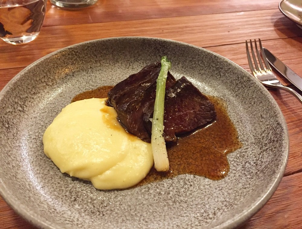 A continuación, llegó el “Rodaballo, salsa de mantequilla blanca encurtidos y huevas de pez volador”. A mi amigo le encantó, a mí no acabó de hacerme tilín. Me incliné más por la propuesta de carne que se presentó en la mesa, “Picaña madurada, salsa Dong Po y patata confitada”. La recuerdo jugosa y acompañada por ese aliño que la hacía muy sabrosa.