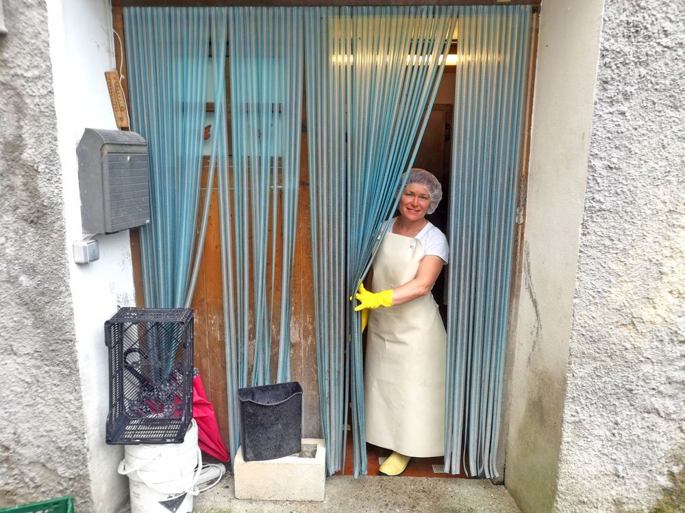 – Podéis visitar a Josune, la quesera. Bajando por la cuesta a la izquierda-, indica.