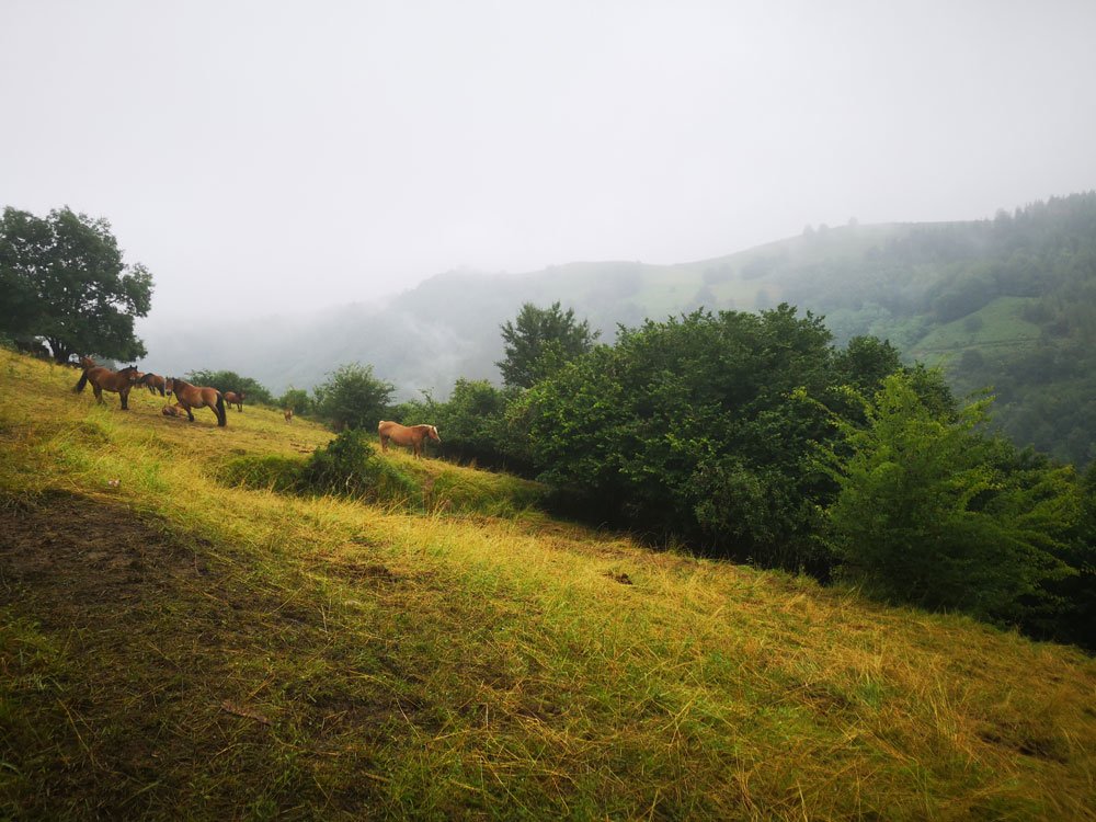 A la entrada de Orexa la niebla es tan densa que asusta un poco. Se ha metido entre los montes, afilados como hachas, y no empezará a difuminarse hasta pasado el mediodía. En jornadas como la de hoy el recurrente chiste de Mordor cobra sentido: la bruma tapa el paisaje, apenas se ven algunas manchas verdes. Todo es una gran sauna al aire libre, solo que estamos a 20 grados un día de julio.