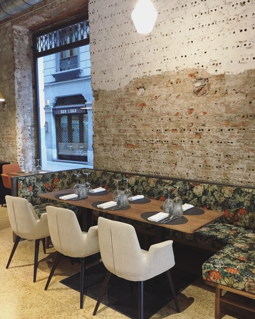 Llegados a este punto podemos decir que el local, en cuanto a decoración, no sorprende. Ya estamos más que acostumbrados al toque industrial, a las sillas de diseño y a los estampados florales. Se aprecia el esqueleto del edificio, con hormigón y ladrillos a la vista. Bonito, no cabe duda, pero ya no llama la atención como antes. Echamos de menos un detalle que nos gustó, la infografía: la persiana con el astronauta de los antiguos almacenes. Figuraba como elemento decorativo en las paredes de PATRI. Esperamos verlo pronto, una vez acaben de restaurarlo.
