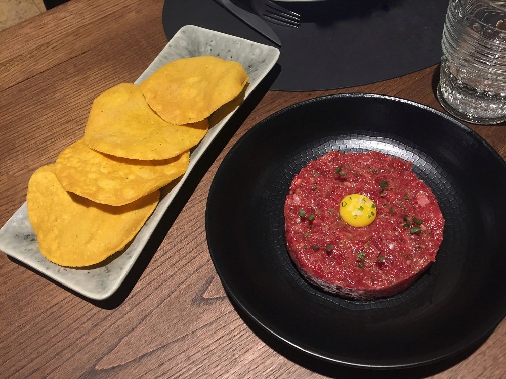 Para cuando empiezo a saborear los primeros tragos de mi txakoli Itsasmendi, llegan los dos entrantes que hemos pedido. El steak tartar empieza a ser una de mis peticiones estrella, y si lo hay en carta, pocas veces lo rechazo. «Steaktartar ‘LUISMI’ con talo crujiente» se presenta como una ración generosa de la que fácil podrían picar tres o cuatro personas, aunque solo éramos dos. Coronado con una yema, el aliño es acertado y las tortitas crujientes para acompañarlo también nos gustan mucho.
