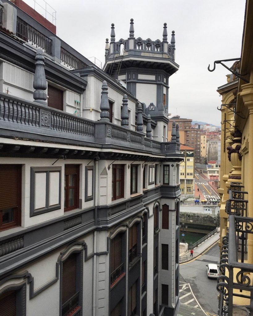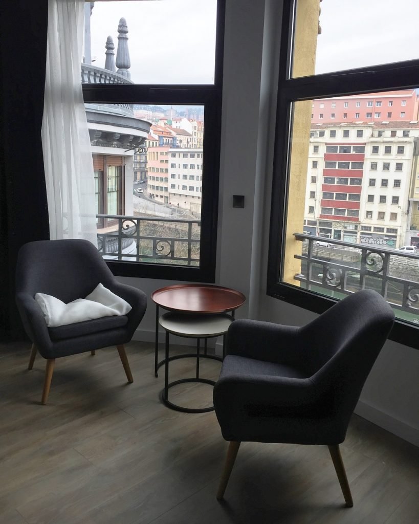 Visitamos el hotel en plenas navidades acompañados por Ander Elortegi, su director, y vimos cómo entonces aún se ultimaban los detalles. Las obras de rehabilitación y acondicionamiento han sido duras y se han alargado más del tiempo establecido. Estructura de hormigón a la vista, un ascensor que lo atraviesa y recorre cada una de las vidrieras, que se han mantenido. Huele a pintura fresca, en la pared están marcando con spray los números de las habitaciones. Nos enseñan una de las mejores, la del torreón, con una cama de dos metros en la que perderse, bañera a la vista y una cristalera con fabulosas vistas a la ría, el puente de La Merced y Bilborock.