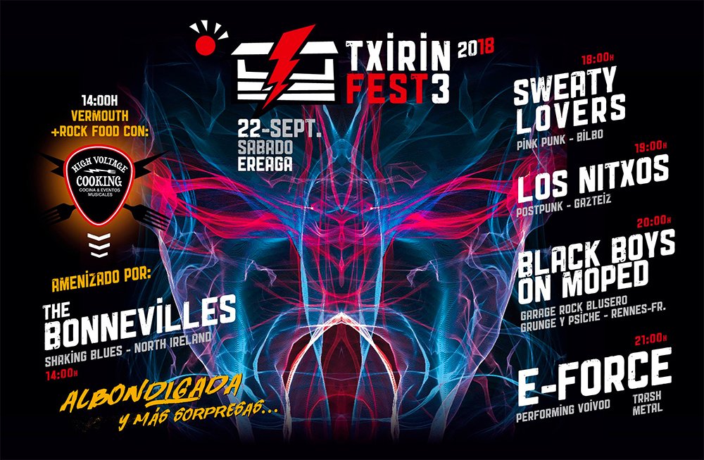Txirin Fest 2018 arrancará a eso de las 14 h. con un vermú musical animado por el directo de los irlandeses The Bonnevilles. Tras el aperitivo, habrá «albondigada» (y alguna sorpresa culinaria más a cargo de High Voltage Cooking) para todo el que quiera quedarse a comer en la terraza del local. Después, podrás aprovechar para darte un chapuzón o echar una siesta playera, ya que los conciertos de tarde arrancarán a eso de las 18 h. El garage de los franceses Black Boys On Moped, el postpunk de los vitorianos Los Nitxos y el thrash metal de E-Force (banda de Eric Forrest que recuperará en directo el repertorio de los míticos Voivod), están ya confirmados, aunque se espera algún nombre más. Todo, claro, al aire libre y disfrutando de la caída de la noche sobre el mar Cantábrico.