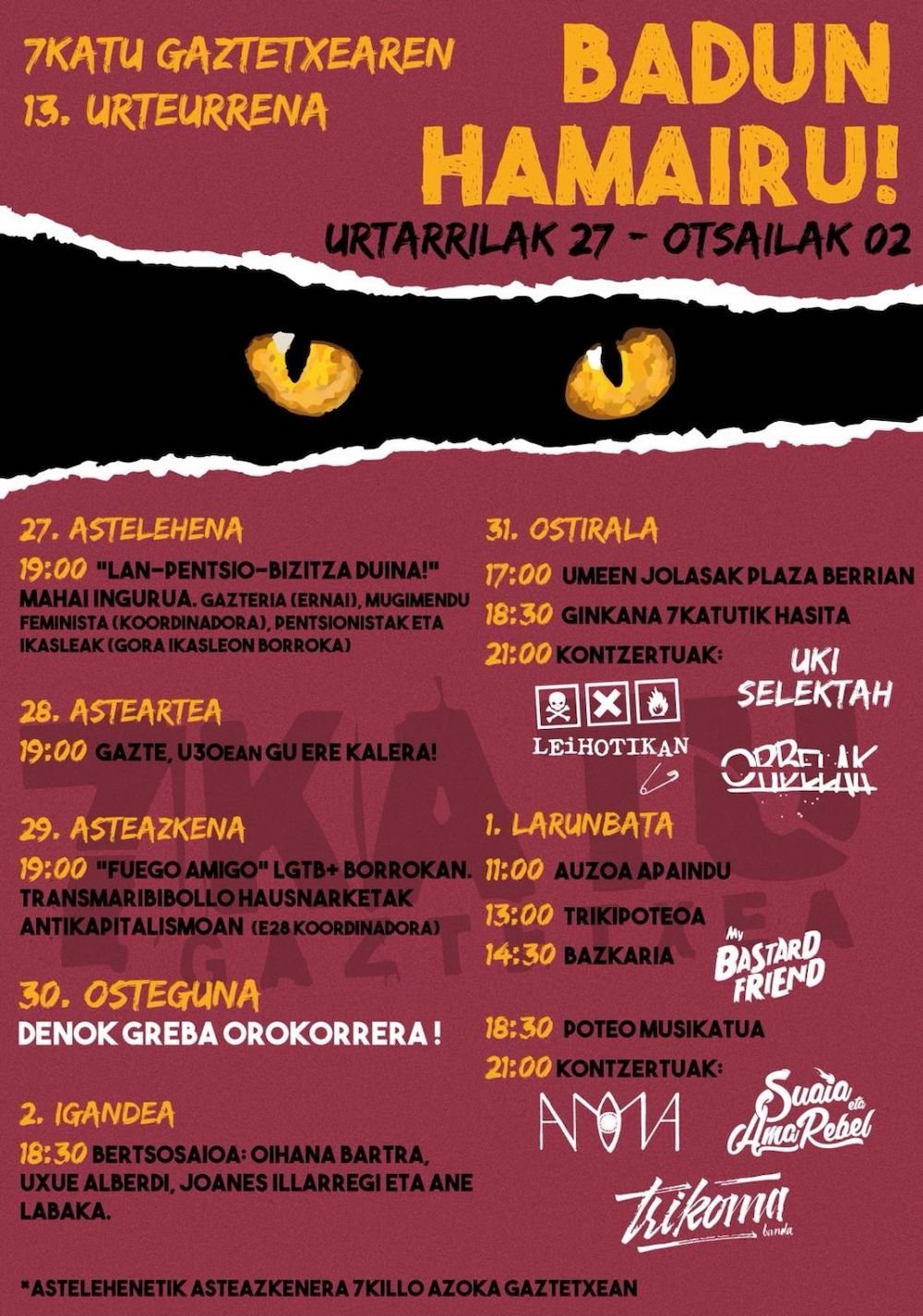El gaztetxe 7Katu (sí, el de las escaleras de Solokoetxe) cumple 13 años y anda de celebración: Mesas redondas, juegos infantiles, ginkanas… El sábado 1 tendrán, además, trikipoteo (13:00h), comida popular amenizada por My Bastard Friend (14:30h), poteo musical (18:30h) y, finalmente, conciertos (21:00h): Amooma, Trikoma y Suaia eta Ama Rebel. Para el domingo, apunta: bertsos con Oihana Bartra, Ane Labaka, Uxue Alberdi y Joanes Illarregi (a partir de las 18:30h).