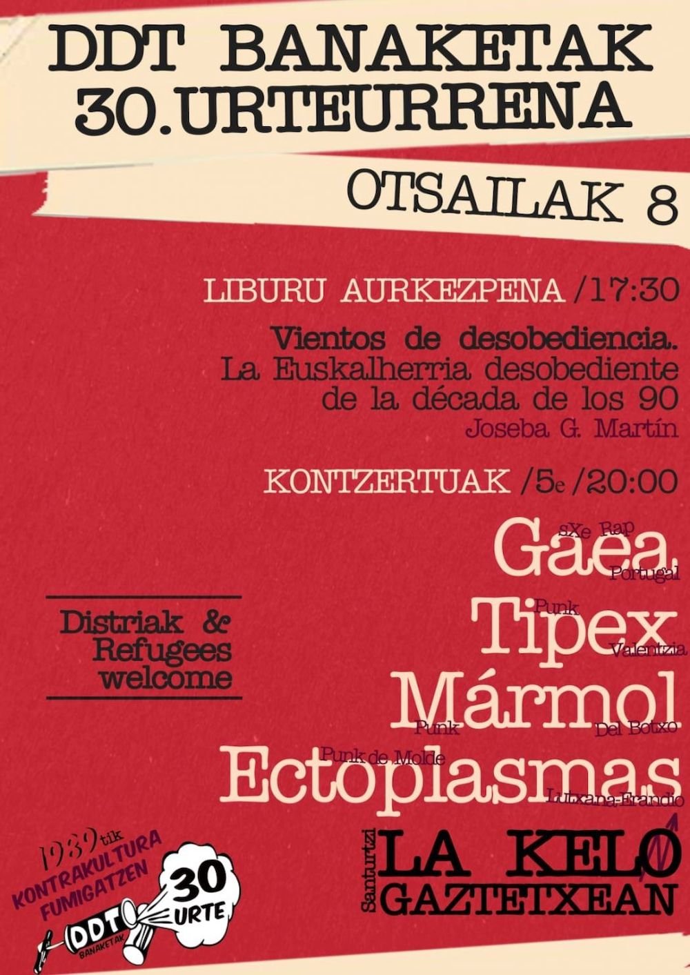 El sello, editorial y distribuidora alternativa DDT cumple 30 años dedicadas a la difusión de cultura autogestionada, política y librepensante. Para celebrarlo, en Santurtzi podremos conocer una de sus últimas ediciones, el libro «Vientos de desobediencia», a cargo de su autor Joseba G. Martín, y disfrutar en directo del rap animalista del portugués Gaea, de la nueva ola del punk mediterráneo con Tipex, pasando por el pop para punks y punk para pops de los bilbaínos Mármol y el veteranismo de Ectoplasmas.