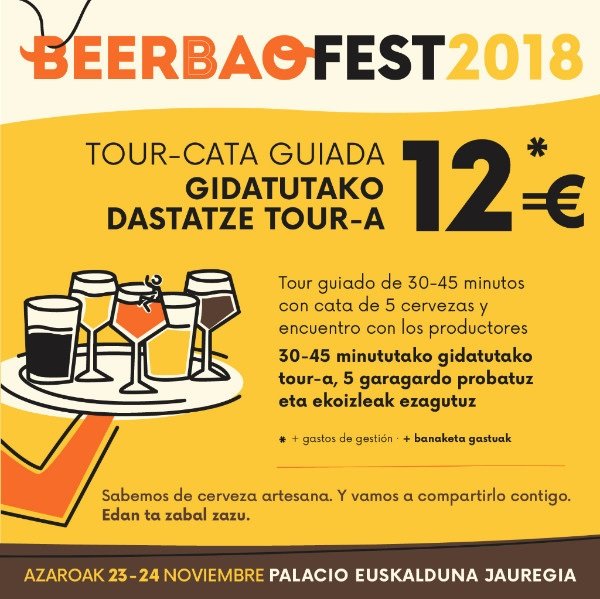 Parafraseando uno de los versos del «Gernikako Arbola» y lema de la Universidad del País Vasco (”Eman ta zabal zazu”), ”Edan ta zabal zazu” («Bébelo y difúndelo») es la consigna de los tours guiados por Beerbao Fest. Y es que esto no es el «Salón del Sumiller», por lo que no hace falta ir aprendido de casa. Con que te mole ir de cañas, ya estás capacitado. Los organizadores son los expertos, y están deseando compartir contigo lo mucho que ellos disfrutan de este mundo. Por eso han ideado tours-cata guiados de iniciación, en los que probarás 5 variedades, podrás conocer a los productores y aprenderás cómo esa delicia líquida ha llegado del campo hasta tu vaso. Hay plazas disponibles en horarios de mañana y tarde y en castellano y euskera. Cuestan 12 euros + gastos (reserva pronto, que vuelan). Y, si eres de los que ya controlan de cervezas, pues te saltas el tour y directamente a degustar lo que irá brotando (y alternándose) de los 30 cañeros instalados en el Palacio Euskalduna.